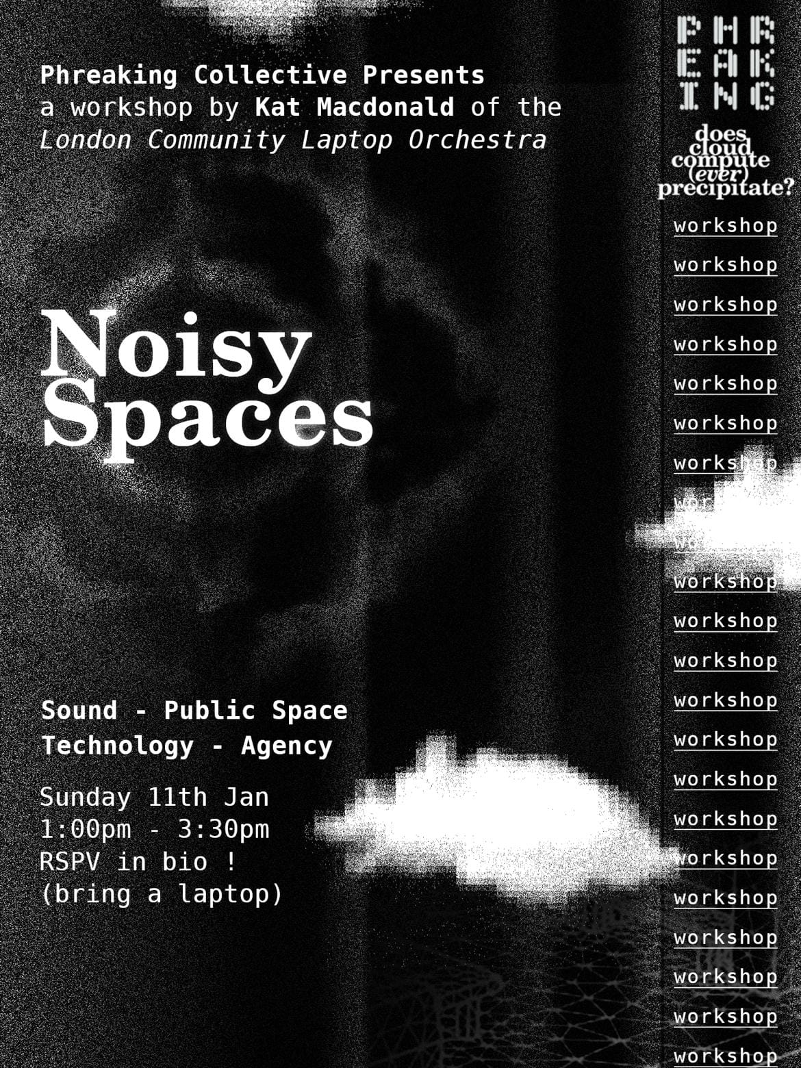 I'll be hosting my performance lecture / workshop Noisy Spaces as park of Phreaking Collectives show 'does cloud compute (ever) precipitate'. Tickets here!